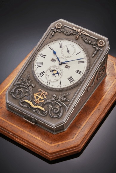 أيضًا، ستُعرض في مزاد شهر ديسمبر ساعة مكتب فضية من باتيك فيليب Patek Philippe تعود إلى عام 1928 تشبه ثقالة الأوراق، وتُعد واحدة من ثلاث ساعات فقط معروفة من هذا الطراز صنعتها الدار، إذ تعود الساعتان الأخريان إلى جامعَي الساعات ورائدي الأعمال هنري غريفز جونيور وجيمس وورد باكارد.